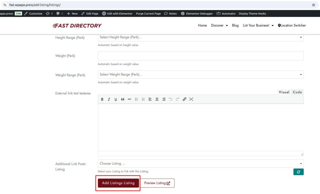 This is the frontend view when adding a new listing.