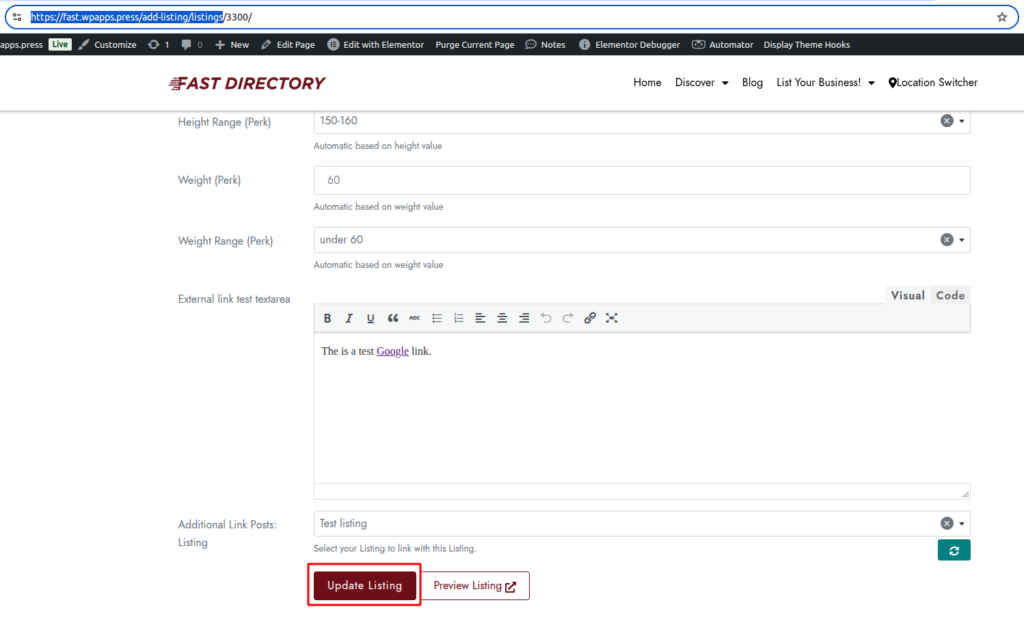 This is the frontend view when editing an existing listing. The submit button label dynamically changes to “Update Listing”, indicating that the listing already exists and is currently being modified.