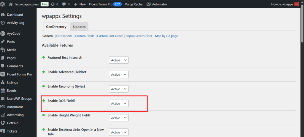 • Navigate to wpapps → geodirectory → Enable DOB Field?