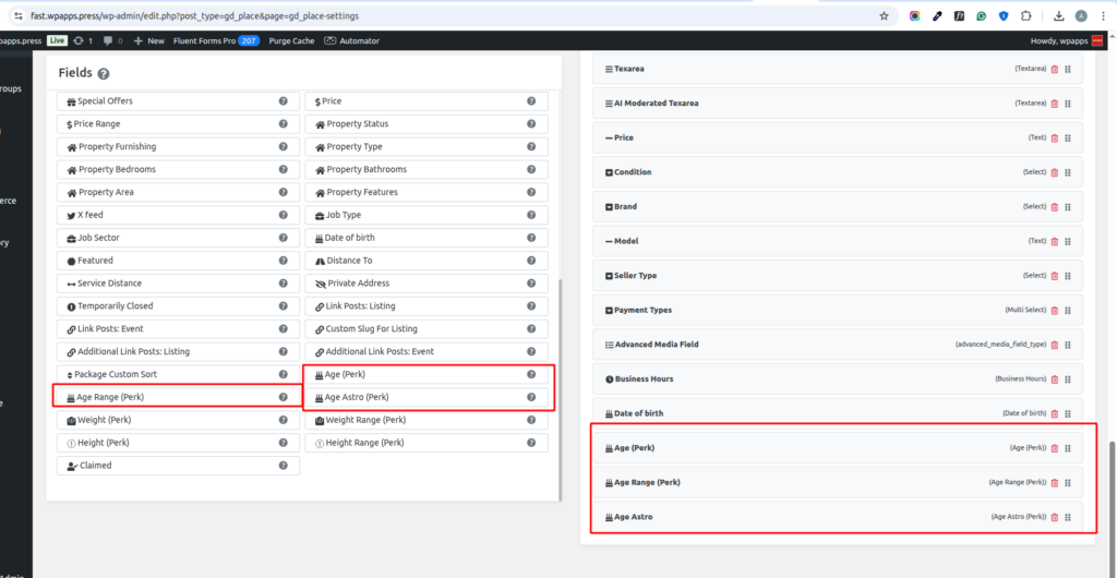 Go to your CPT, select Settings, and add Custom Fields. Once enabled, new custom fields will appear, including Age (perk), Age Range (perk), and Age Astro.