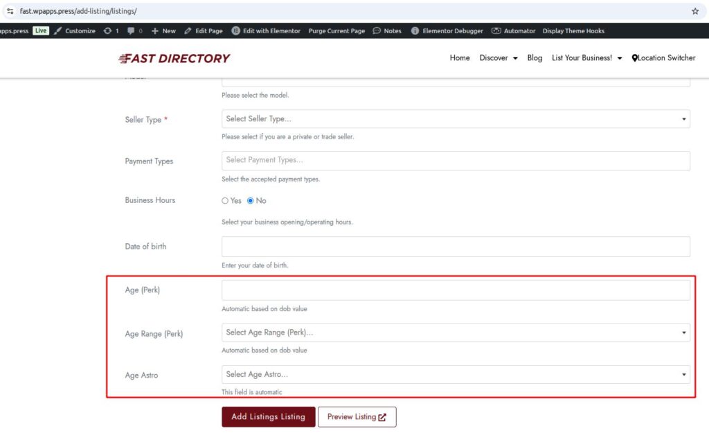 This shows the DOB field as displayed on the frontend Add Listing page.
