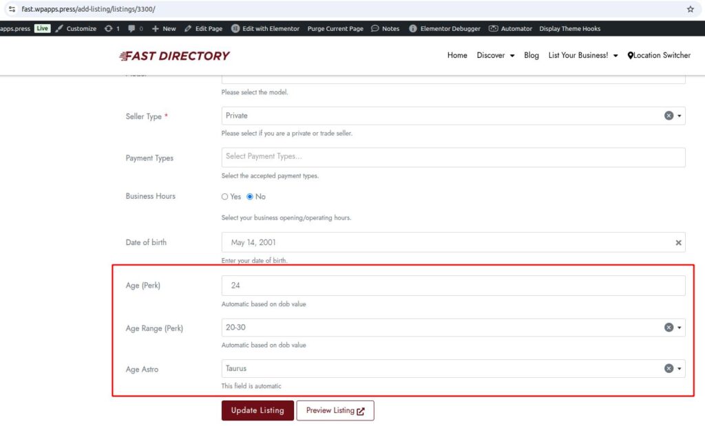 This setup explains how to enable and configure the Date of Birth (DOB) field in GeoDirectory. Once enabled, new custom fields related to age information will be available.