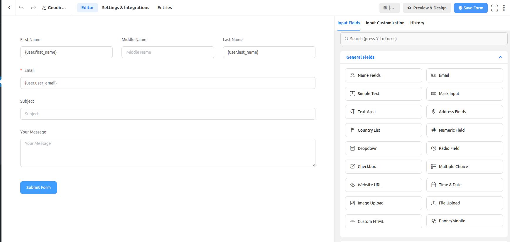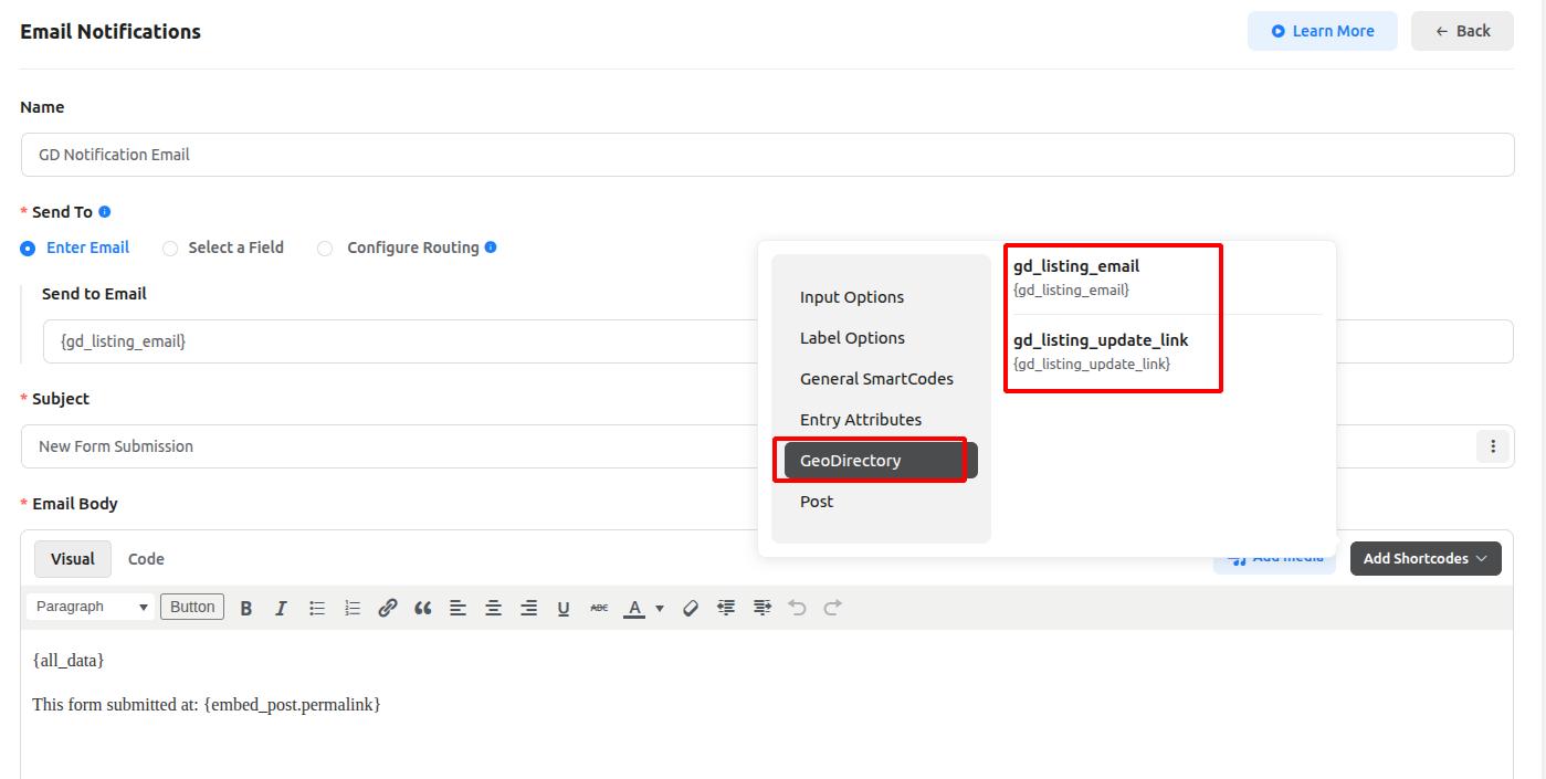 - When configuring email notifications in Fluent Forms, you can use GeoDirectory smartcodes such as