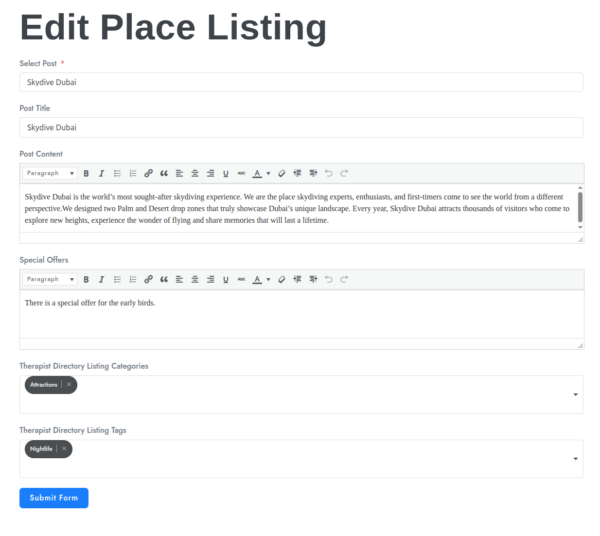 - Listing owners can click the Edit Listing button on the listing details page. The Fluent Form opens with pre-filled listing data, allowing updates without accessing wp-admin.