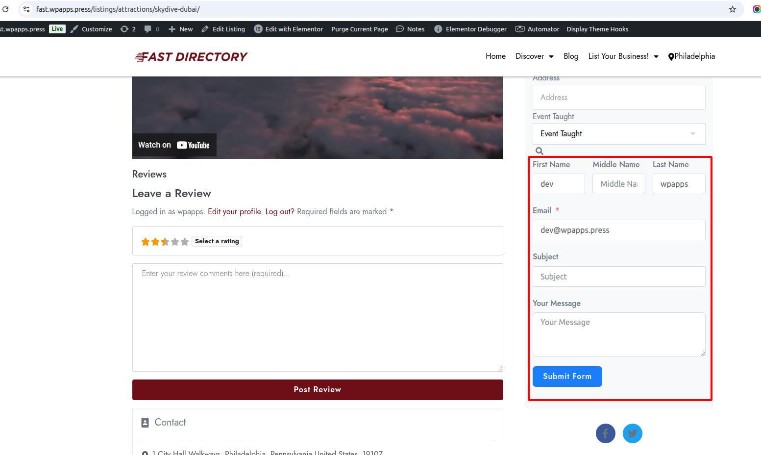 A contact form is displayed directly on the single listing page, allowing visitors to contact the listing owner.