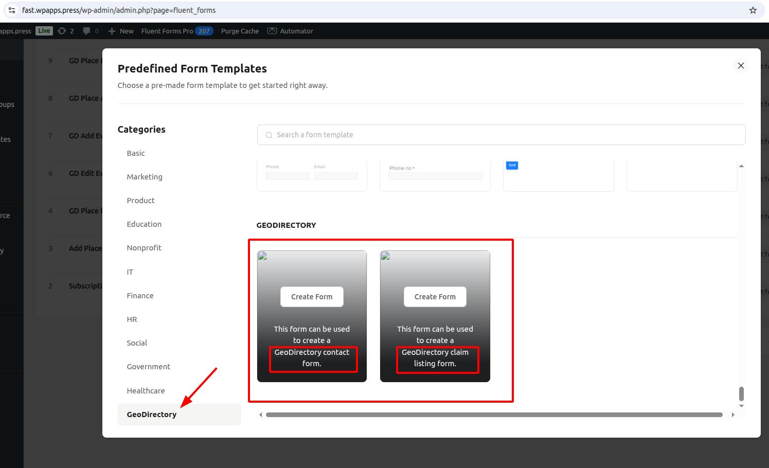 - Go to Fluent Forms → Add New Form, then click GeoDirectory under Predefined Form Templates.