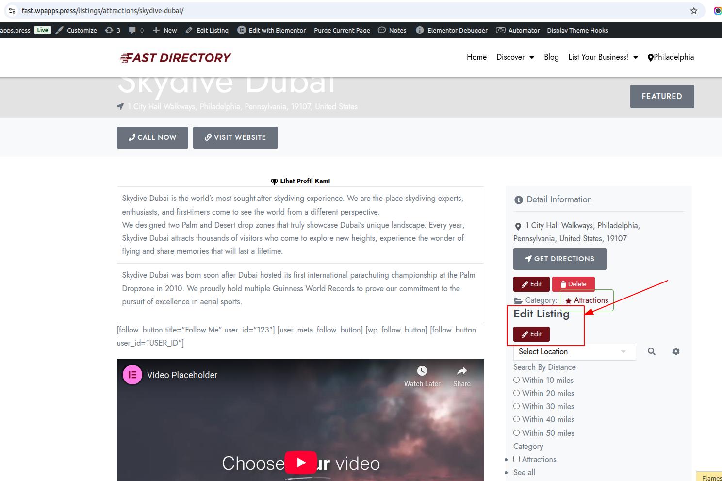 An Edit Listing button is shown only to the listing owner, allowing frontend editing.