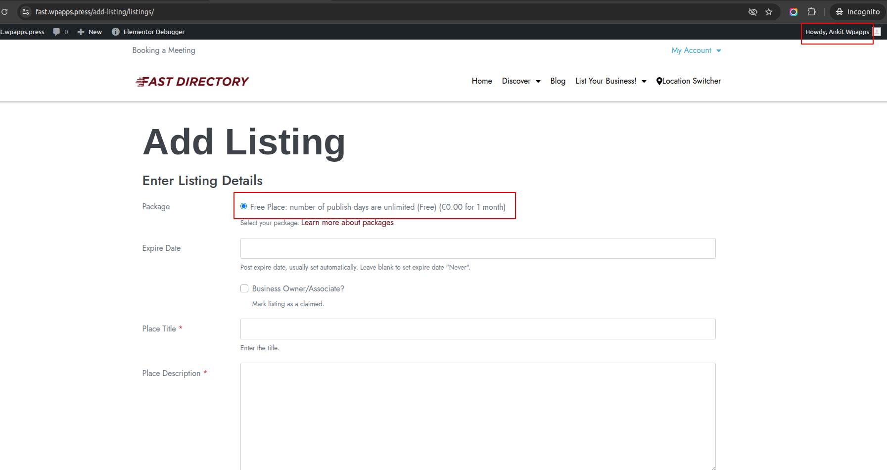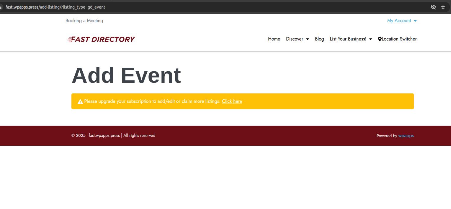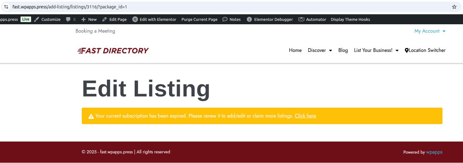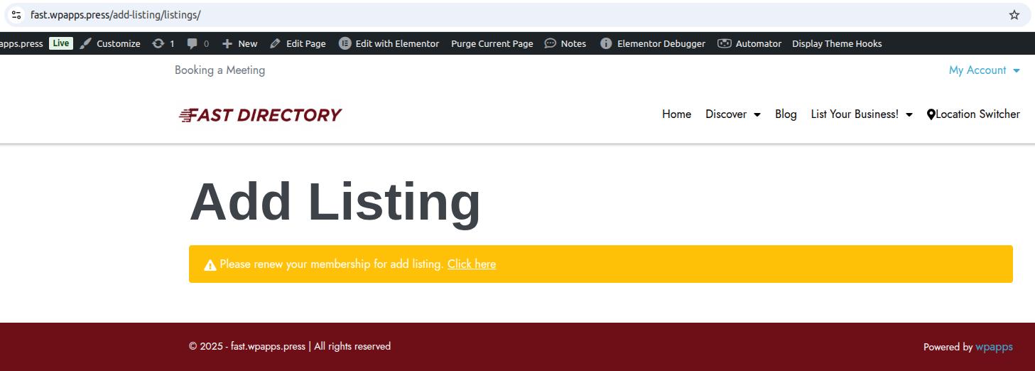 - Add listing page shown listing limit message: This is the view of add listing page when we want to add again but can’t because the limit is exhausted.