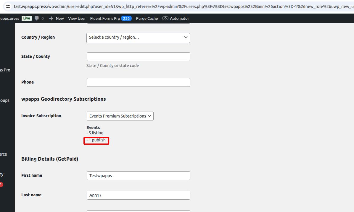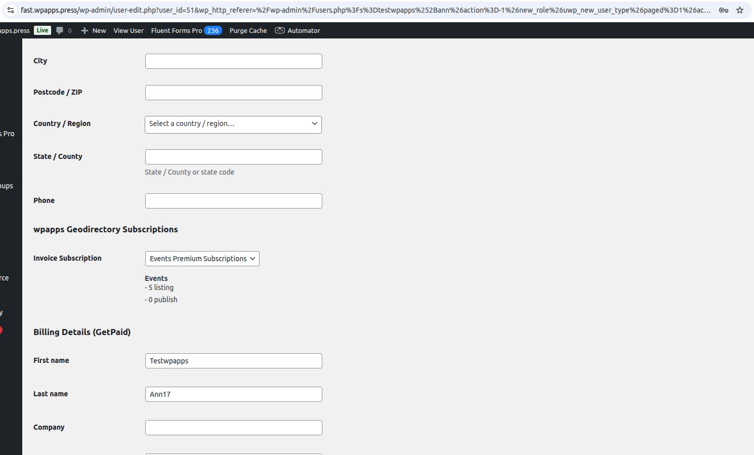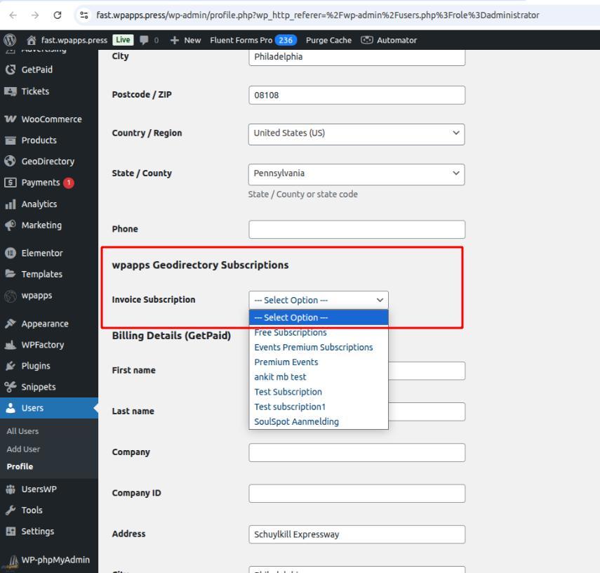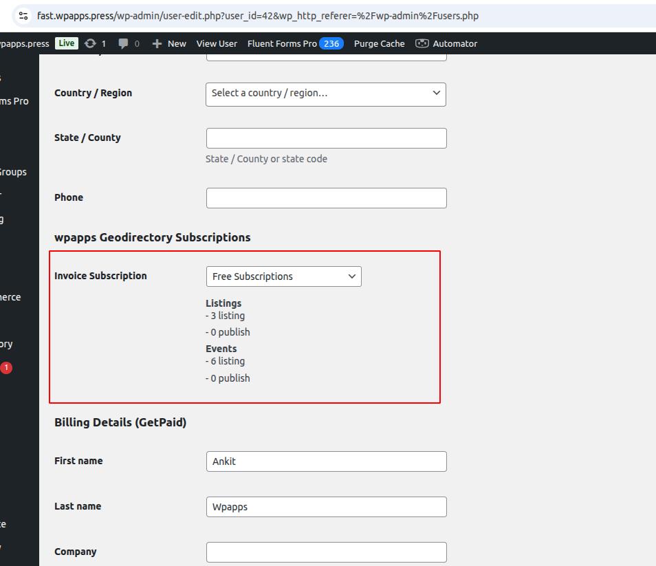 - GetPaid: This is user profile invoice subscription from GetPaid will be in user info admin.