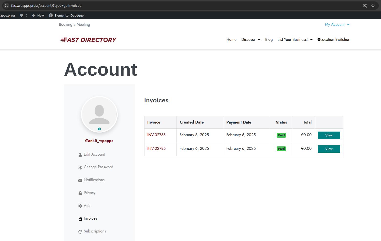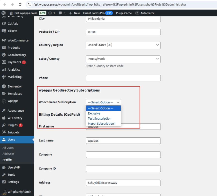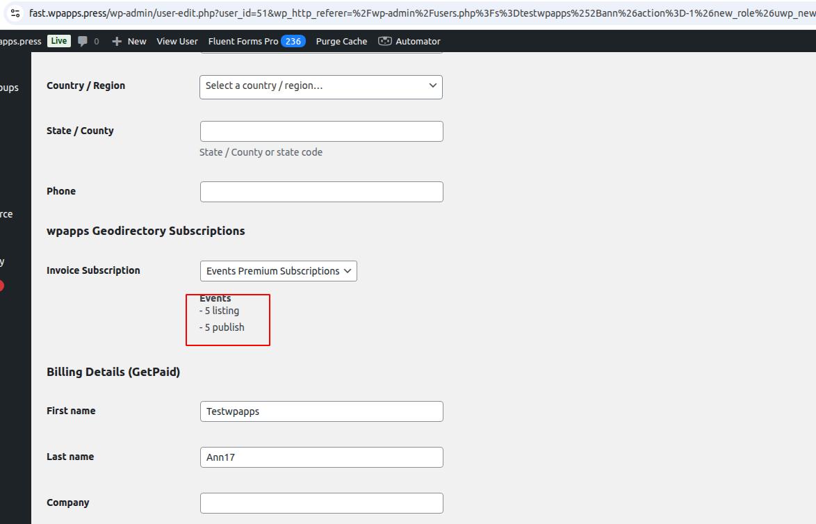 - GetPaid: This is user profile invoice subscription from GetPaid will be in user info admin.