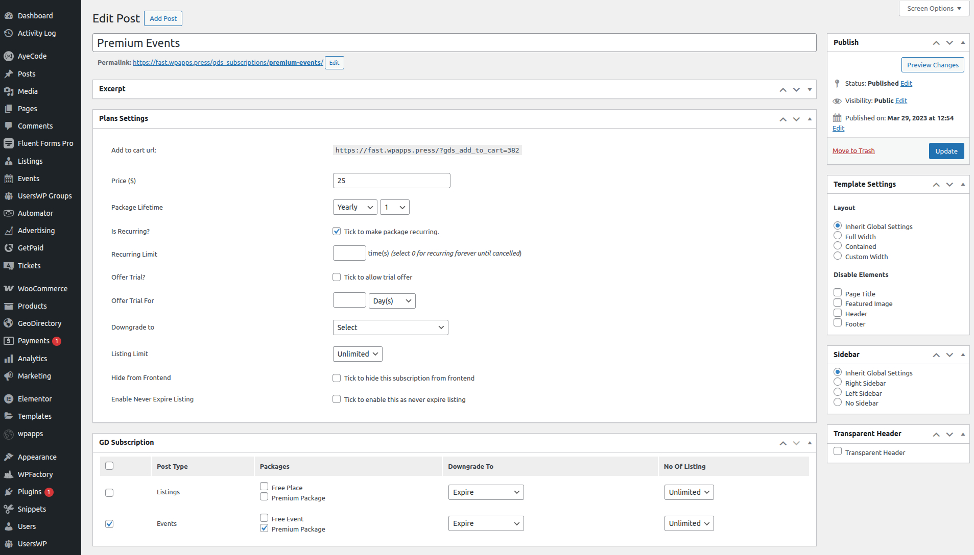 Wpapps Publisher is a powerful GeoDirectory add-on that turns your directory into a monetized platform. It lets you create subscription packages with custom limits on: