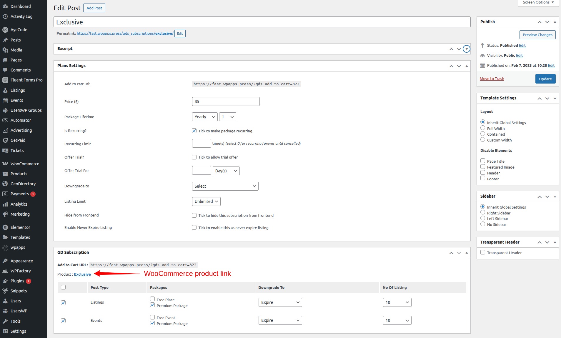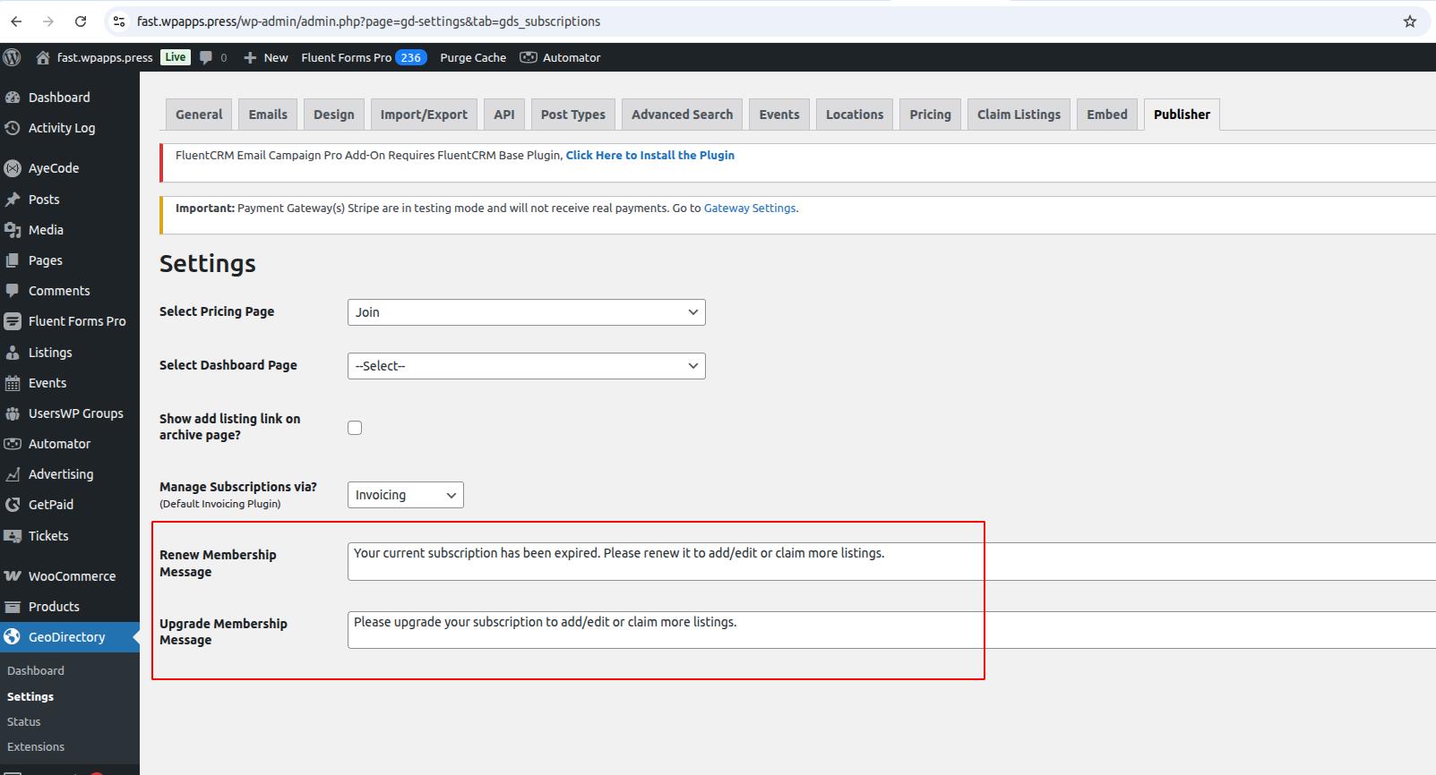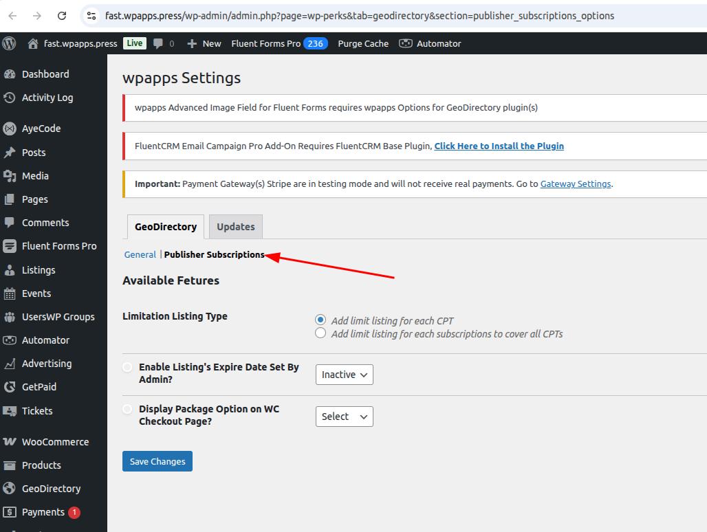 - Sub settings page in wpapps > GeoDirectory > Publisher Subscriptions you can setting. You can setting according to needs: Limitation listing type, Enable listing expire date set by admin, Display package option on WC checkout page.