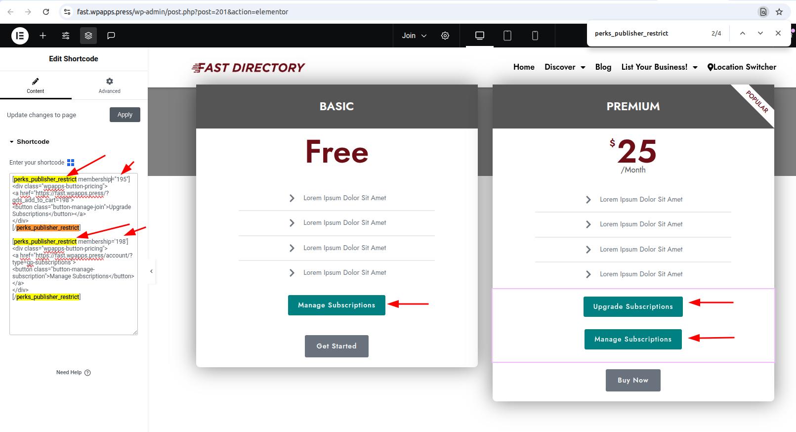 - Admin: In pricing page template you can add pricing detail and add widget shortcode then add Publisher Restriction Shortcode like this according to URL gds_add_to_cart.