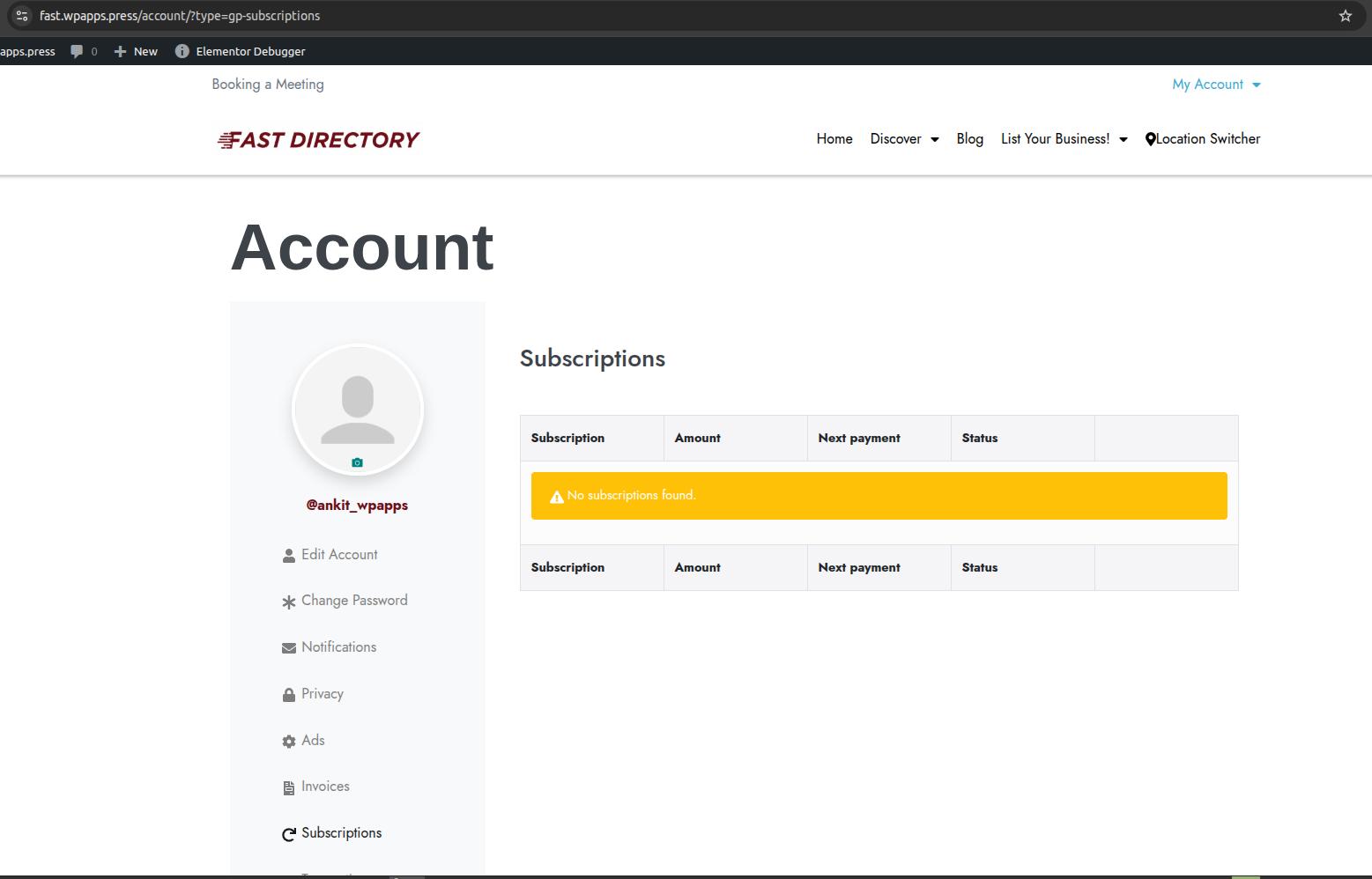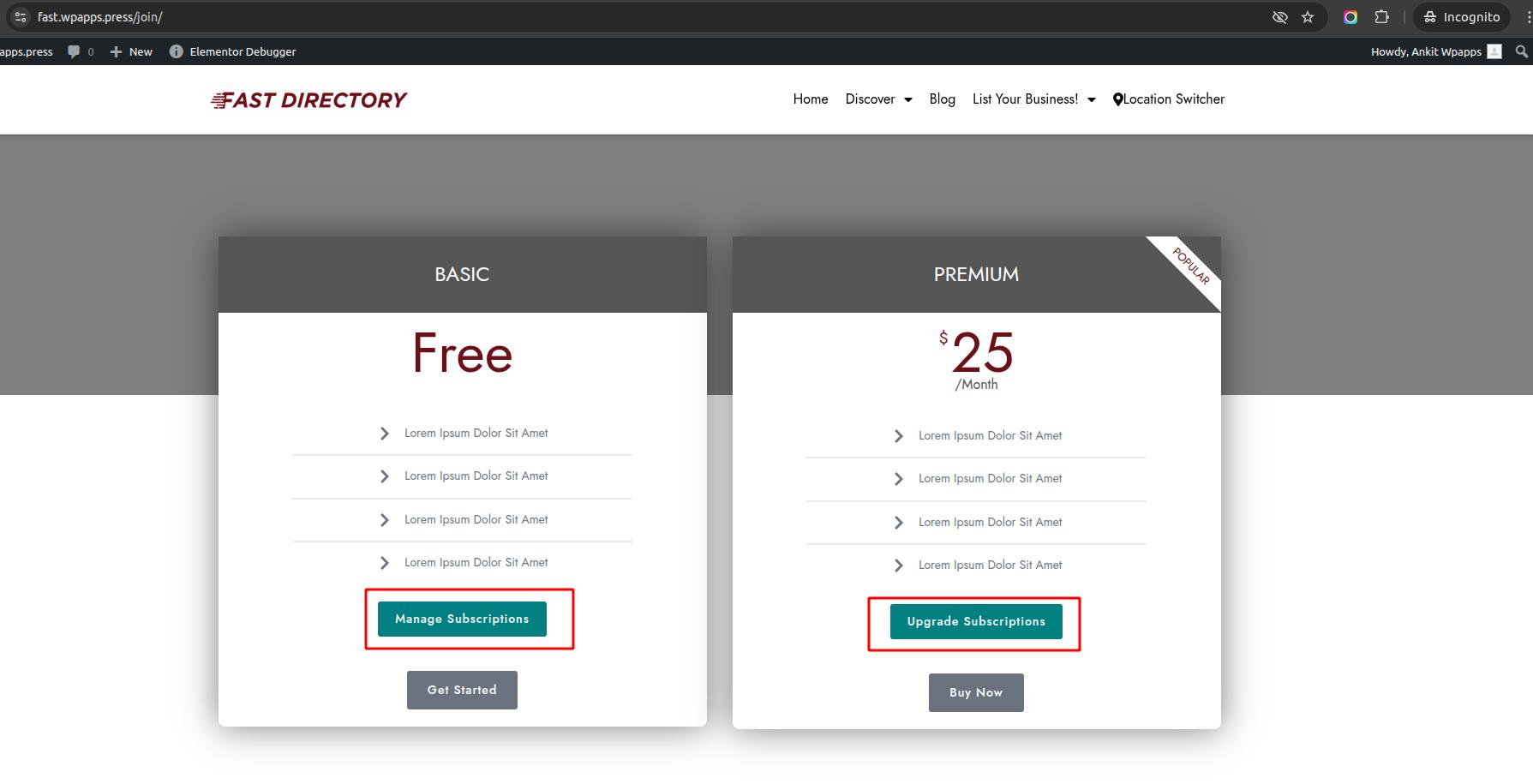 - Output with Membership: If we already give Membership it will show manage subscription and you can upgrade Membership (all listings we create will be adjusted or changed with new package).