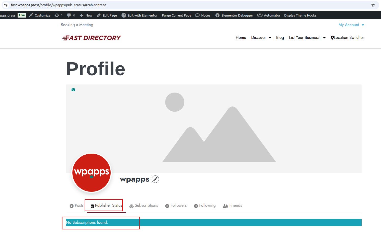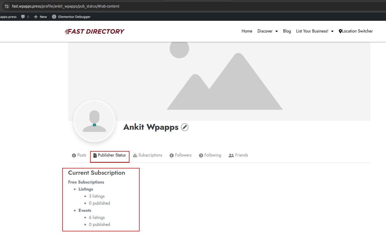 - Frontend user’s profile page Without subscription: This is the view of publisher status in user profile if no subscription