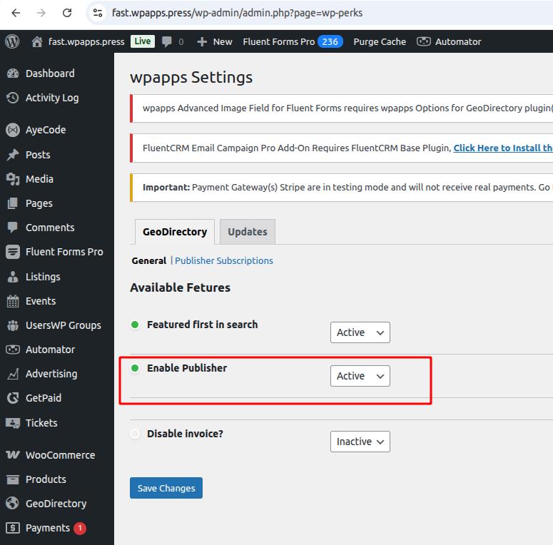 - Enable setting in wpapps > GeoDirectory > General > Enable publisher.