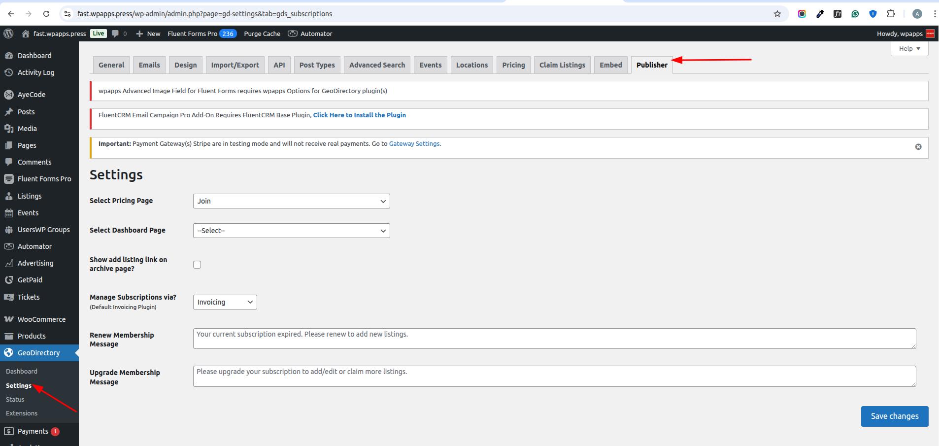 - Settings tab under the GeoDirectory settings. And you can setting: Pricing page, Dashboard page, Manage subscription invoicing.
