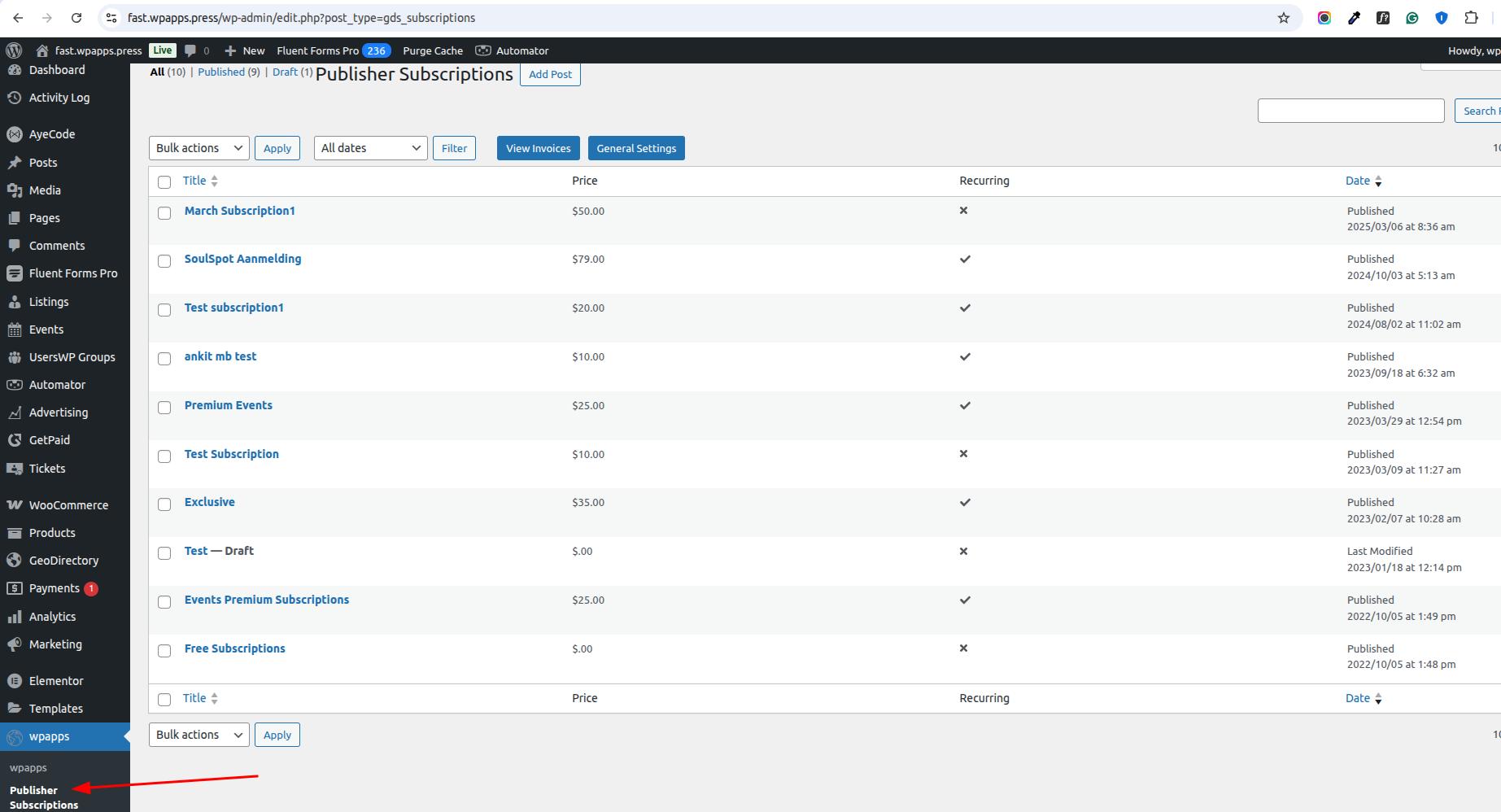 - Publisher’s custom post type for the subscription packages. wpapps > Publisher Subscriptions you can add post to add subscriptions.